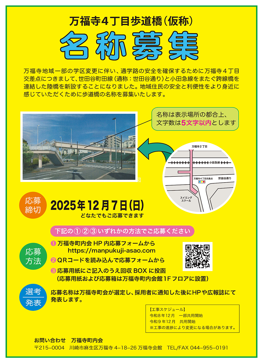 万福寺4丁目歩道橋(仮称)名称募集 2025.11.11 下記よりご応募ください 万福寺歩道橋名称応募フォーム☆万福寺町内会員のみなさまへ☆万福寺4丁目交差点(スイミングスクール前)~万福寺2丁目に新しく歩道橋が設置されます。注意事項を確認の上、お一人様3件までご応募可能となっておりますのでお待ちしております。住所、氏名、電話番号は応募内容の確認や...
